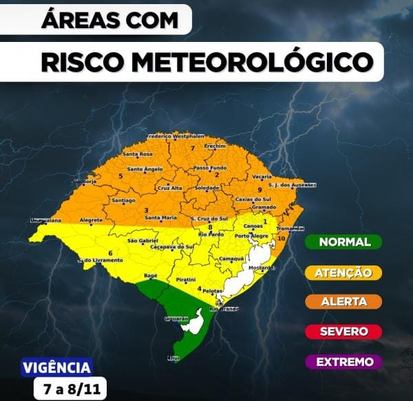 Entre a madrugada de sexta-feira (7/11) e o decorrer de sábado (8/11), o aprofundamento de um sistema de baixa pressão e posterior formação de um ciclone extratropical no oceano provoca tempestades severas no Oeste, nas Missões, no Noroeste, no Centro e no Norte do Estado. Estão previstas chuvas intensas (com acumulados expressivos), rajadas de vento que podem ultrapassar os 100 km/h, queda de granizo de grande porte e descargas elétricas. Há possibilidade de formação de uma linha de instabilidade com potencial de rajadas de vento severas e tornados, especialmente nas regiões Noroeste e Norte, na tarde de sexta.
