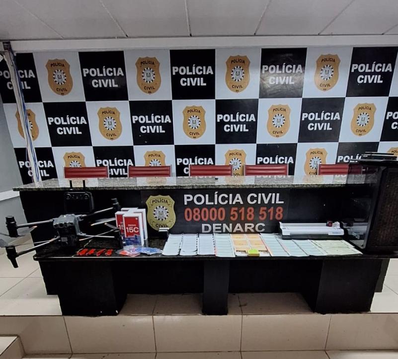 A ação ainda resultou na apreensão de quatro telefones novos preparados para arremesso, oito telefones dos suspeitos, um controle de drone, três hélices de drone, três armas, duas carteiras falsas de Delegados de Polícia, selos e espelhos de autenticação de cartórios, cédulas falsas de carteiras de identidade e dois carros, sendo um deles elétrico avaliado em 400mil reais.